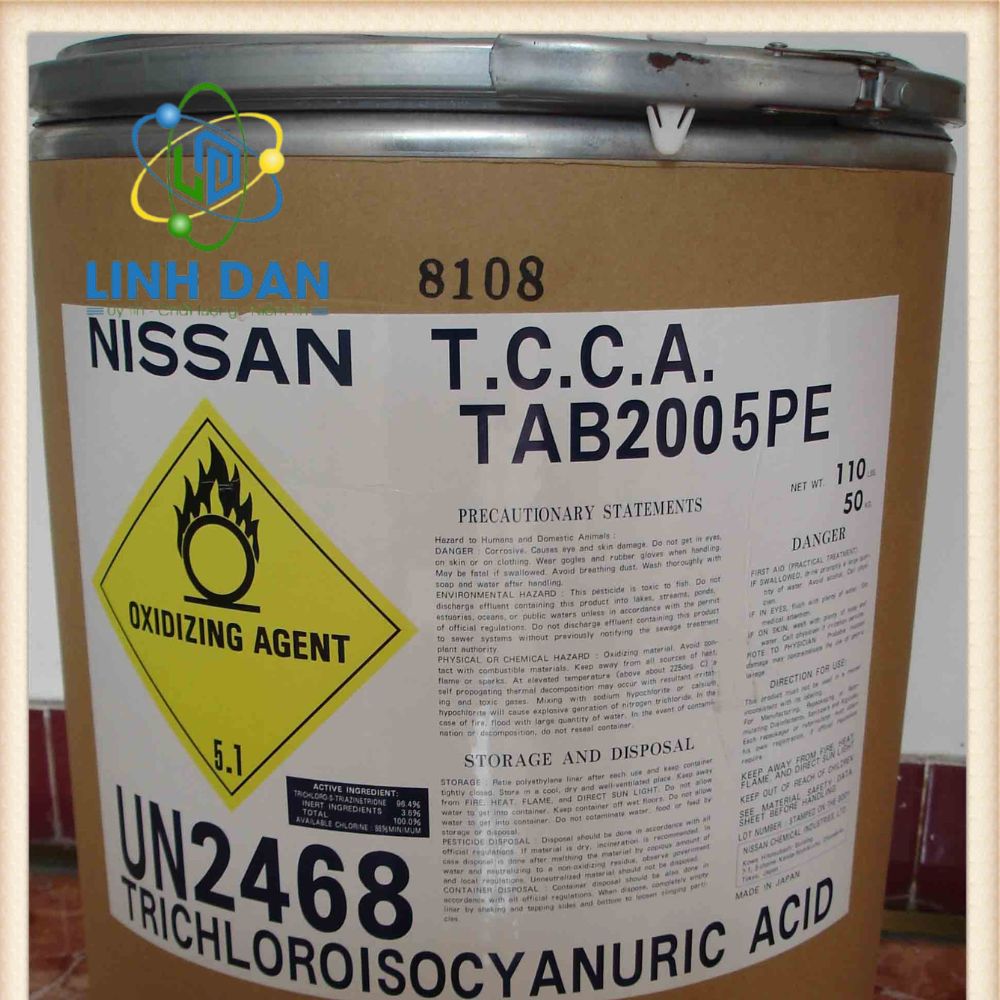 TCCA Nissan Nhật Bản 90% (Tricholoroisocyanuric acid) được là sản phẩm hóa chất được sử dụng phổ biến trong: Tiêu diệt các vi sinh vật, diệt tảo, rong rêu trong nước, xử lý nước trước khi nuôi tôm, tiêu diệt các mầm bệnh,…
